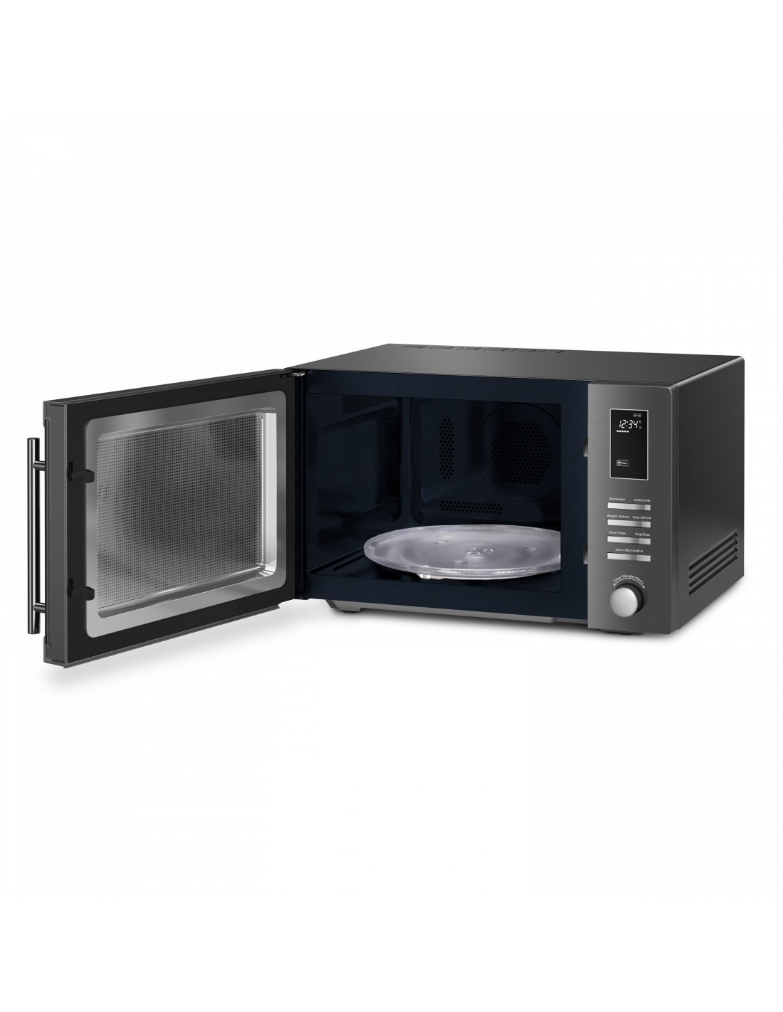 Four micro-ondes Gril pose libre, Électronique, 900 W, 25 litres, cavité en céramique bleu, afficheur à LED blanches, programmateur électronique durée et fin de cuisson, gril 1000 W, 5 niveaux de puissance, 6 fonctions et 10 programmes automatiques, plateau tournant intégré 31,5 cm Ø, sécurité enfant, Plateau pizza