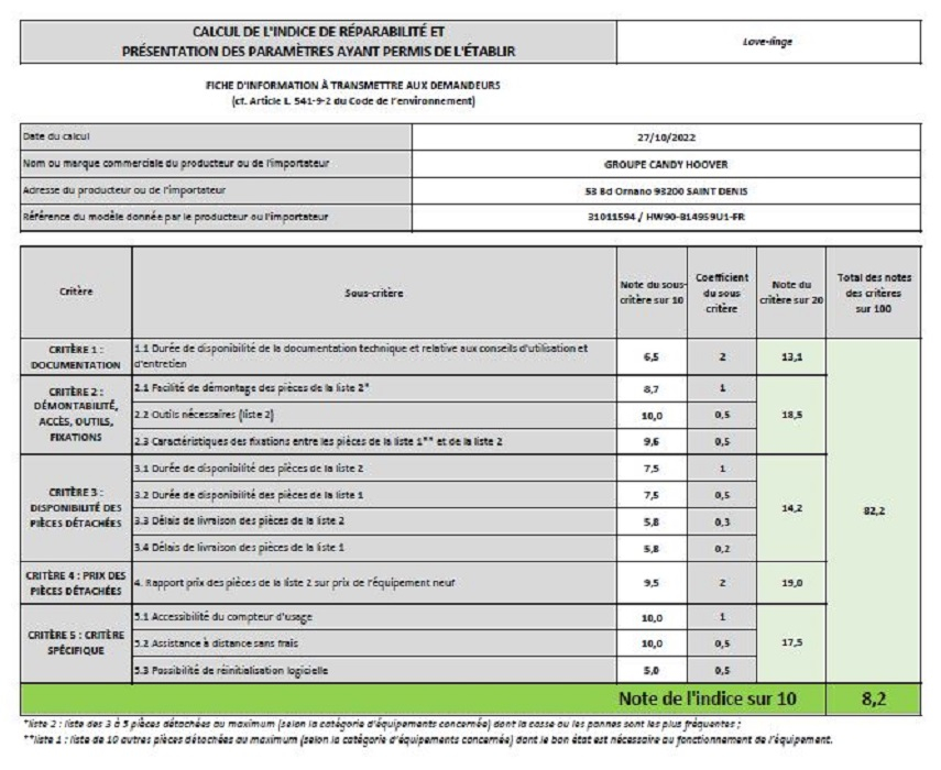 - Conso. énergie en lavage(KWh/100 Cycles)