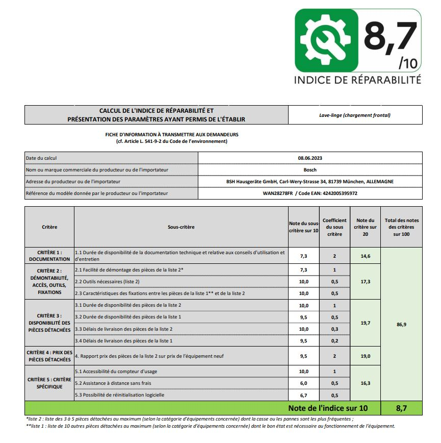 Classe dÔÇÖefficacité énergétique : A sur une échelle allant de A à G Energie / Eau : 46 kWh / 47 litres Capacité : 1 à 8 kg Durée progr. Eco 40-60 : 3:33 h Classe dÔÇÖefficacité dÔÇÖessorage : B Vitesse d’essorage : 1400 - 0 tr/min** Niveau sonore essorage : 72 dB (A) re 1 pW Classe dÔÇÖefficacité sonore : A La fonction Rajout de linge permet de rajouter ou retirer des vêtements en cours de cycle Grand écran indiquant vitesse d’essorage, temps restant, fin différée 24h et recommandation de charge Volume du tambour : 65 l EcoSilence Drive: moteur induction garanti 10 ans, alliant longévité, robustesse et silence ActiveWater Plus : consommation d’eau adaptée, même aux petites charges, grâce à la détection automatique de charge Protection anti-débordement Design AntiVibration : stabilité et silence Détection mousse Détection antibalourd Sécurité enfants Signal sonore fin de programme 32 cm porthole, Blanc with 171° opening door